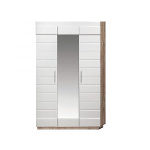 Петли без доводчиков, задняя стенка изготовлена из ХДФ. К правой двери крепится зеркало т. 4 мм с гравировкой. За левой дверью три съемные и две несъемные полки, за правой дверью штанга для одежды. При желании петли с доводчиками можно приобрести дополнительно и самостоятельно установить их. Правая часть выступает вперед по отношению к корпусу, что создает 3Д эффект.