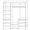 На боковых стенках закреплены декоративные накладки из МДФ пленочного толщиной 8мм. в цвет фасада. Шесть ящиков на шариковых направляющих H=35 AKS LIGHT, задняя стенка изготовлена из ХДФ. К средней двери крепится зеркало с фацетом 10мм по двум сторонам. Детали шкафа, которые в эксплуатации подвержены механическим повреждениям, облицованы кромкой ПВХ толщиной 2 мм. В левой части шкафа за дверью установлены две съемные полки и одна несъемная. В средней и правой части шкафа за дверями штанга для одежды. При желании петли с доводчиками можно приобрести дополнительно и самостоятельно установить их. Функцию ручки на накладках ящиков выполняет фрезеровка выемка в торце фасада.