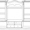 Ящики на направляющих Hettich, петли без доводчиков, задняя стенка изготовлена из ХДФ. При желании петли с доводчиками можно приобрести дополнительно и самостоятельно установить их. Фасад и карниз из МДФ пленочного. Боковые двери с закаленными стеклами с шелкотрафаретной печатью, за ними установлены съемные стеклянные полки толщиной 4 мм. В нише под TV установлена несъёмная полка из МДФ. Декоративные элементы на фасадах из ПУ. Опорой служит имитация подиумаиз МДФ.Размер ниши под TV 1120 x 910.