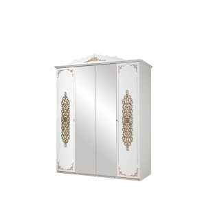 Петли без доводчиков, задняя стенка изготовлена из ХДФ. К средним дверям крепятся зеркала с шелкотрафаретным рисунком. Вставки крайних дверей изготовлены из плиты ХДФ фасадной и имеют радиусную форму. В правой части шкафа за дверями три съемные и одна несъёмная полка, а в левой и средней части установлены штанга для одежды. Средние двери открываются после открытия крайних. При желании петли с доводчиками можно приобрести дополнительно и самостоятельно установить их.