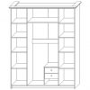 Петли без доводчиков, ящики на шариковых направляющих, задняя стенка изготовлена из ХДФ. Фасад изготовлен из МДФ плёночного и декорирован золотой патиной. В правой и левой части шкафа за дверями несъёмные полки для одежды, а в средней части установлены штанга для одежды и два выдвижных ящика. Зеркало крепится с обратной стороны фасада стеклозажимами. Шкаф комплектуется металлической ручкой со вставкой из стекла напоминающей бриллиант или кристалл. При желании петли с доводчиками можно приобрести дополнительно и самостоятельно установить их.