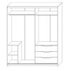 На шкаф установлен механизм шкафа купе Сенатор. Левая дверь изготовлена из зеркальной вставки и вставки из Эко кожи с использованием технологии «Каретная стяжка», устойчивость к истиранию 150 000 циклов. Правая дверь изготовлена со вставками из зеркала с гравировкой в форме ромбов и стекла лакобель белого цвета. Лакобель представляет собой специальным образом окрашенное стекло. Детали шкафа, крышка, боковые стенки, которые в эксплуатации подвержены механическим повреждениям, облицованы кромкой ПВХ. В правой и левой части шкафа за дверями штанга для одежды, также в правой части шкафа за дверями установлены ящики. Система раздвижения Сенатор обеспечивает плавное и бесшумное скольжение дверей и создаёт эффект парения в воздухе.